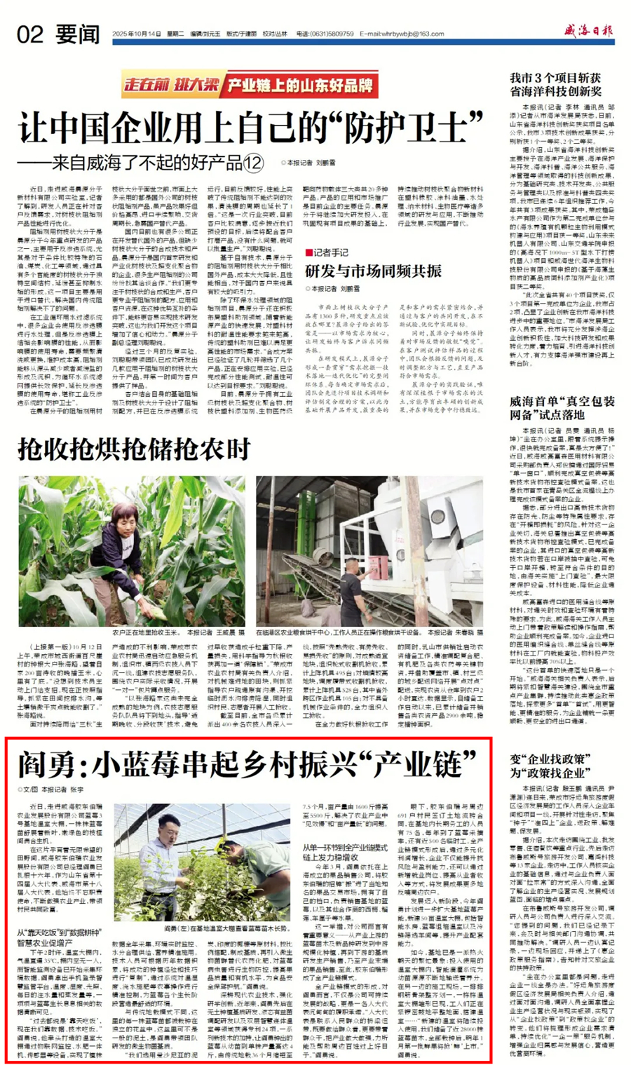 这一举措,对公司而言有着重要意义——从产业上游的蓝莓苗木及新品种研发到中游规模化种植,再到下游的基质研发生产销售,乃至产业末端的果品销售,至此,胶东伯瑞形成了全产业链模式。 全产业链模式的形成,对阎勇而言,不仅是公司可持续发展的战略,更是一名人大代表沉甸甸的履职承诺。“人大代表是联系人民群众的桥梁纽带,既要做给群众看,更要带着群众干,把产业做大做强,力所能及帮助周边百姓过上好日子。”阎勇说。 眼下,胶东伯瑞与周边691户村民签订土地流转合同,在基地内长期务工的人员有75名,每年到了蓝莓采摘季,还有近500名临时工。全产业链模式形成后,通过多元化利润增长,企业不仅能提升抗风险与盈利能力,还可以通过新增就业岗位、提高从业者收入等方式,将发展成果更多地反哺周边农户。 发展迈入新阶段,今年阎勇计划进一步扩大基地蓝莓产能,新建50亩温室大棚,包括智能水房、蓝莓组培温室以及冷链筛选车间等,提升产业配套能力。