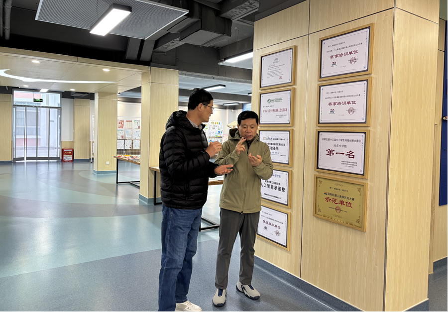 “创办之初,由于受场地和师资力量的限制,学位火爆,经常是‘一课难求’。”冯鲁威回忆说。近年来,在他的奔走协调以及政府部门支持下,他们更换场地,扩大师资队伍,学院也从最初的几十名学员,发展到如今在校学员近500人,活动辐射近3万人次。 在满足群众精神文化需求的同时,针对辖区老年人较多的特点,冯鲁威还牵头打造“6012349”养老便民服务平台,并与社区教育学院深度联动,使社区教育与智慧养老服务无缝衔接,形成“文化学习+生活服务+健康保障”的一站式养老闭环。 “平台整合3500多家加盟企业资源,老人无需奔波,在家门口就能享受到家政、康养、金融等多元服务。”冯鲁威介绍,目前平台服务已覆盖全市66.8万名老年人。 办好人民满意教育 让孩童享受公平优质教育 近日,下午2时许,威海市第二实验小学内,琅琅书声不时飘出窗外,孩子们认真听讲,争相举手回答问题,课堂气氛十分活跃。刚从学校会议室走出,冯鲁威算着时间来到创客楼,与等候在此的家长们畅谈交流。 “孩子最近表现怎么样?”“对学校开设的一些特色课程还有没有意见建议?”“一定要定期和孩子们多沟通多交流。”……刚一坐下,冯鲁威便打开了话匣子,并认真倾听家长对孩子的期望与困惑。