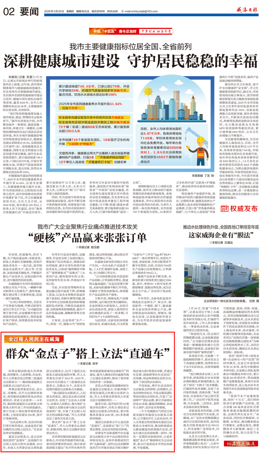 环翠区鲸园街道大世界商圈,商贸繁华、人流密集。在这里,市人大常委会设立的第二批基层立法联系点——鲸园街道基层立法联系点已运行近8年。 带着法规草案进社区、进小区、进楼栋,召开立法调研座谈会,依托鲸园直播间普及法律法规知识、讲述立法故事……8年间,鲸园街道基层立法联系点将联系点和代表工作站深度融合,累计完成11部法规草案的意见征集,上报意见建议256条,其中27条被采纳。 “立法这种大事,还会问问我们老百姓的看法。这就是我们最信赖的全过程人民民主。”社区居民李宗华感慨说。 基层立法联系点,是立法听取民意的“直通车”,也是践行全过程人民民主的生动载体。2015年,全国人大常委会设立首批基层立法联系点,拉开了基层立法联系点建设发展的序幕。市人大常委会分别于2016年、2018年、2024年先后建立了三批基层立法联系点,总数达35个,实现全市范围内基层立法联系点全覆盖。 “通过基层立法联系点,人民群众的意见、建议直达地方国家立法机关,实现了立法由人民参与、法规由人民制定,极大地扩大了基层人民群众参与地方立法的深度和广度,丰富了全过程人民民主的实践和内涵。”市人大常委会法工委有关负责人说。 群众的“金点子”搭上立法“直通车”,市人大常委会认真研究、积极采纳,地方立法脚步更加坚实有力。 在环翠区鲸园街道基层立法联系点,针对我市旅游市场升温、夜间经济繁荣的实际,部分休闲旅游船主提出“允许符合条件的休闲旅游船舶夜间出海航行”的建议,被写入修改后的《威海市海上交通安全条例》,推动了我市夜间经济进一步发展; 在乳山市城区街道暨府前社区基层立法联系点,牡蛎养殖户希望加强乳山牡蛎立法保护力度,市人大常委会将其列入年度立法计划调研项目…… 截至目前,我市现行的22部地方性法规中,共有21部征求过基层立法联系点的意见,累计收集各类建议2620条,250多条被研究吸纳。 基层立法联系点不止是民意“直通车”,还是群众“家门口”的普法课堂、法治宣传的前沿阵地。 环翠区竹岛街道翠竹社区基层立法联系点有个远近闻名的乐哈哈诗友会。这些年靠着成员们的“头脑风暴”,创作出《法治精神放光芒》《幸福全靠法当家》《维护宪法靠大家》等普法诗歌,并通过社区群、晨练群等向社区居民广泛传播,用这种喜闻乐见的方式,提升了居民的法治意识。 不仅如此,翠竹社区还依托立法联系点的律师、法律顾问,以及乐哈哈诗友会、平安志愿巡逻队等居民普法宣传队伍,打造了“法润翠竹”普法品牌,累计开展普法活动60余场,覆盖消费维权、未成年人保护、反诈安全等领域。 一个个充满烟火气的民主创新实践在各基层立法联系点涌现,让万缕民声汇入法治长河。市人大常委会将持续深化基层立法联系点全域布局,推动阵地建设从数量覆盖向质效提升迈进,切实打通立法民意收集—研判—转化—反馈的全流程闭环,让更多基层“金点子”精准转化为立法成果,助力打造更高水平的法治威海、平安威海。 | ||||